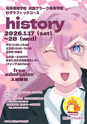 [概要]ITグラフィックコースに所属する学生の作品展です。様々な「History」に思いは馳せて描いた力作の数々をご鑑賞ください。イラストレーターとしても活動する講師・西田ユウ氏の作品もお見逃しなく。
